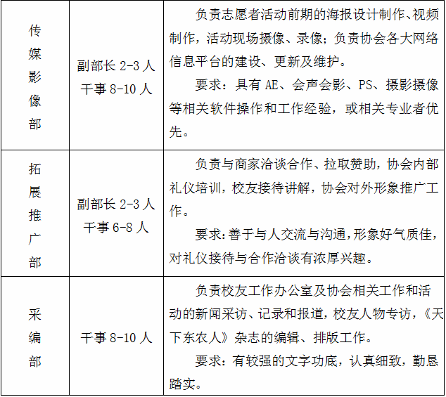 东北农业大学校友工作志愿者协会成立于2012年,在学校校友工作办公室的指导下开展工作,该协会主要负责校友联络、返校接待、校友采访、会议服务、信息收集、庆典活动组织策划、校友网和校友刊物采编、校友公共平台信息发布等一系列与校友有关的工作和活动。目前协会分为办公室、采编部、活动部、拓展推广部、传媒影像部五个部门,面向全校师生和海内外校友开展了协会会徽征集、校友信息征集、老照片征集、微故事分享、微基金宣传、“我的东农,我的家”主题征文大赛、免费发放校园生活服务地图、“毕业义卖,感恩母校”主题活动等活动。协会现对各部门副部长及干事进行纳新,具体方案如下:
