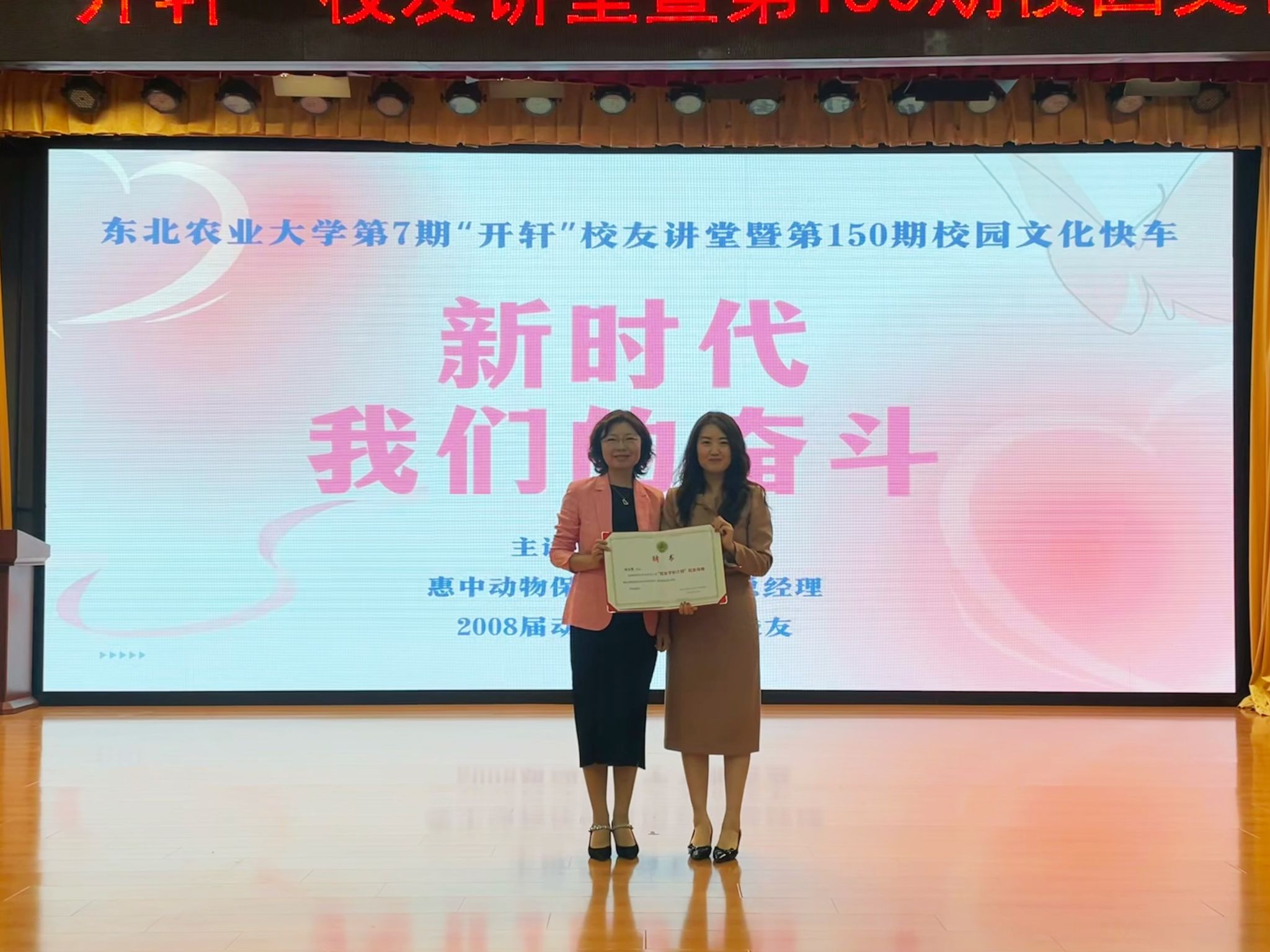 讲座中,刘玉秀讲述了自身在东农求学、出国留学以及毕业多年的工作和生活经历,分享了从勤朴励学到追求卓越的奋斗故事、对推进宠物医药卫生事业发展和维护宠物身心健康的宝贵经验,并从“抱负能量、思维模式、情绪适应、人际互动、任务执行”5个方面对企业角度优秀人才选拔标准进行细致分析。刘玉秀在报告中多次强调前期积累和坚持信念对达到事业高位的重要性,她表示,危机就是机遇,行动胜于思考。同时,她勉励东农学子努力成为“情绪稳定、不言放弃、干困难事、立大格局”的人。刘玉秀校友敬畏生命的职业信仰以及温柔强大的女性力量,启发了同学们对职业发展和人生方向的全新认知和深度思考。