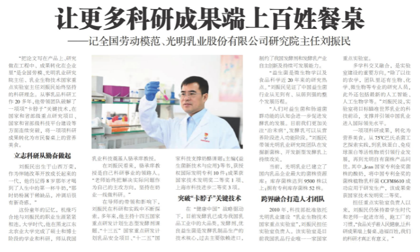 工作期间,刘振民坚持产学研深度融合,主持“十二五”至“十四五”国家重点研发计划项目与课题,先后获得67项发明专利,发表36篇SCI论文。作为乳业科技领军人物,刘振民践行“做中国最好的乳制品企业”理念,主导搭建国际化科研平台,带领上海乳业生物工程技术研究中心连续三次获评“优秀”,乳业生物技术国家重点实验室荣获“优秀类企业国家重点实验室”,以科技力量赋能国民健康,为中国乳品产业核心竞争力提升作出突出贡献。